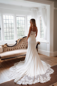 Sparkle and crepe the perfect balance! Hello WD172! The beautifully intricate bodice of the dress shimmers as the crepe fabric flows gracefully, creating an elegant silhouette that moves effortlessly with each step. The delicate lace detailing on the straps adds a touch of timeless romance, while the subtle sparkle of embedded beads catch the light.