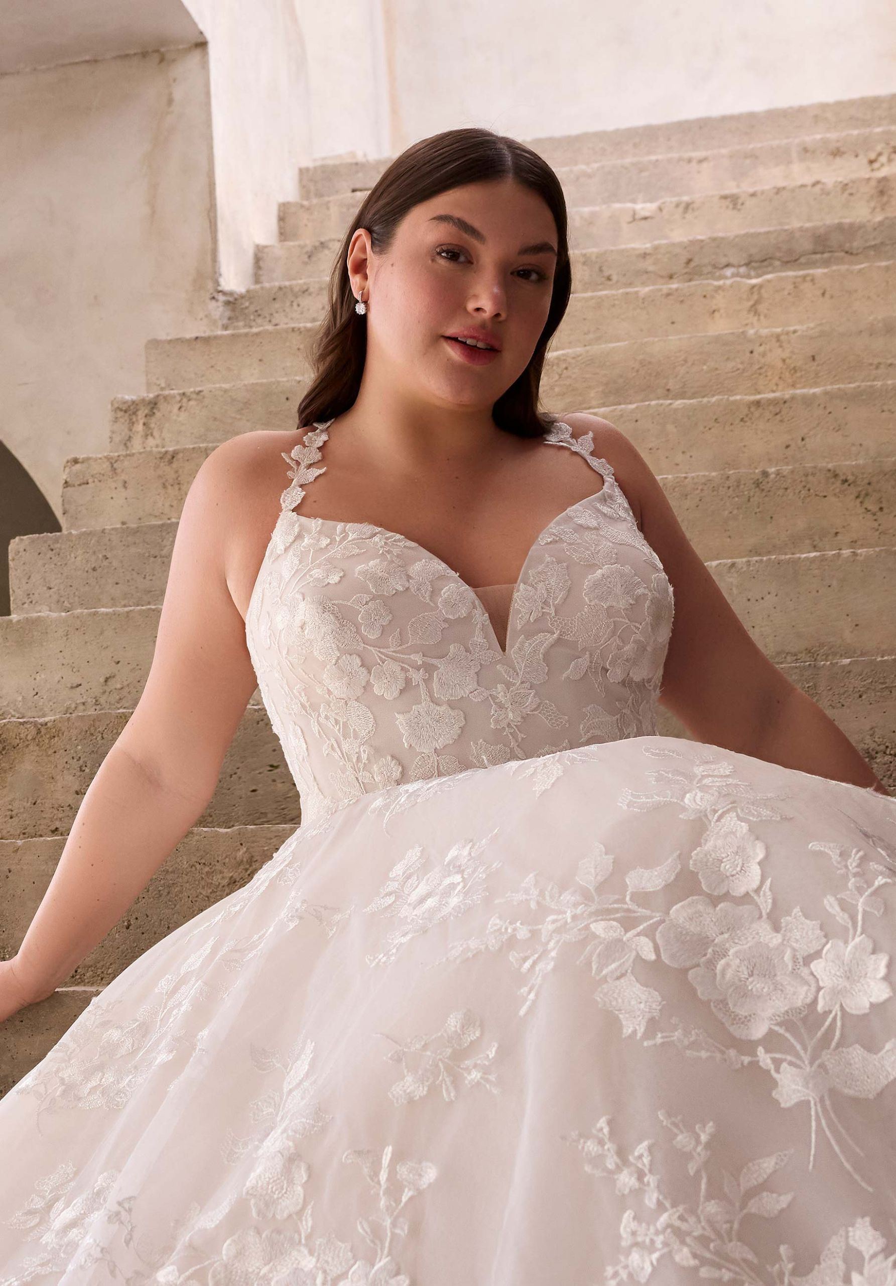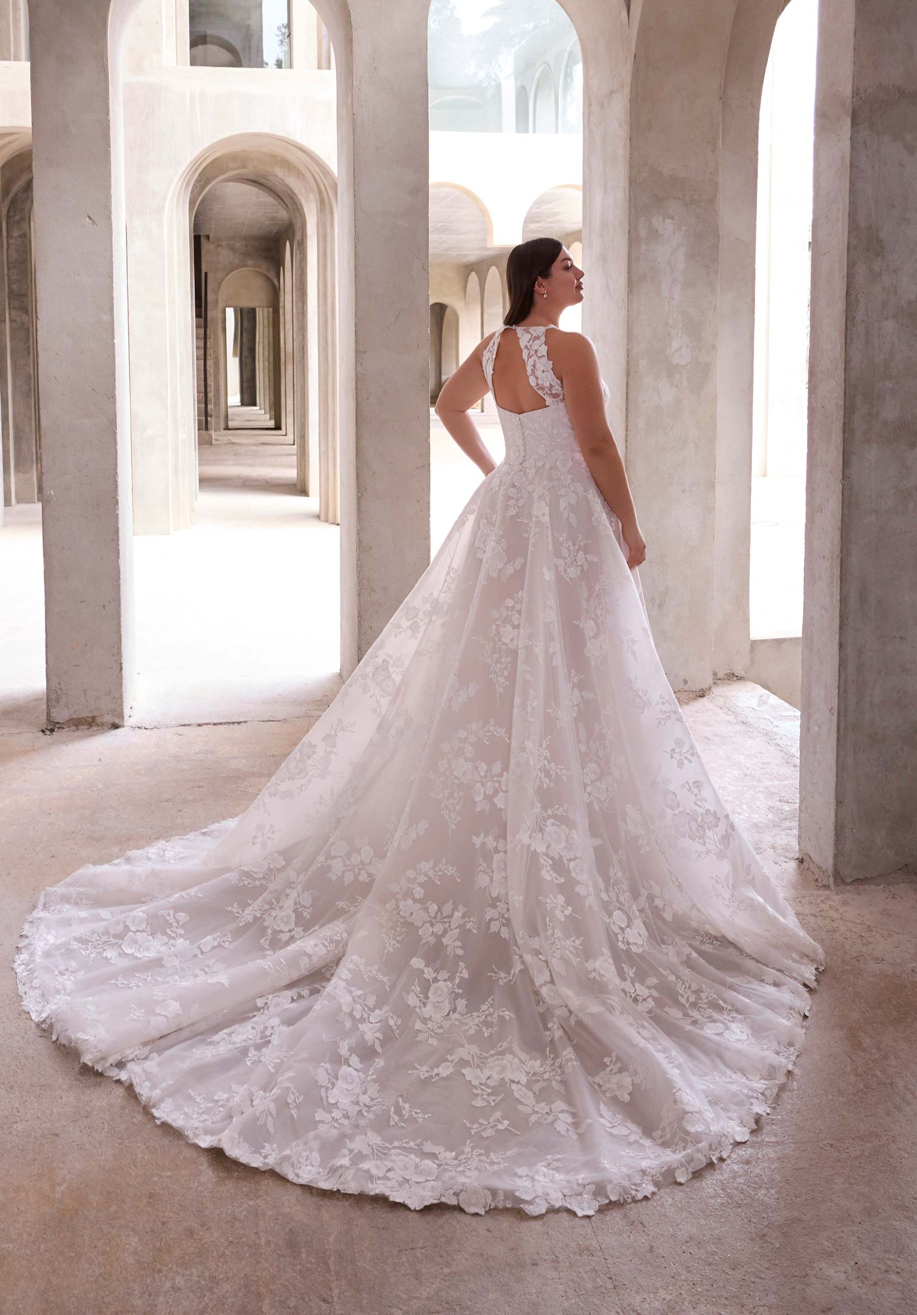 A-line wedding dress has a stylized v-neck bodice with straps and a keyhole back designed with princess seams in corded lace.