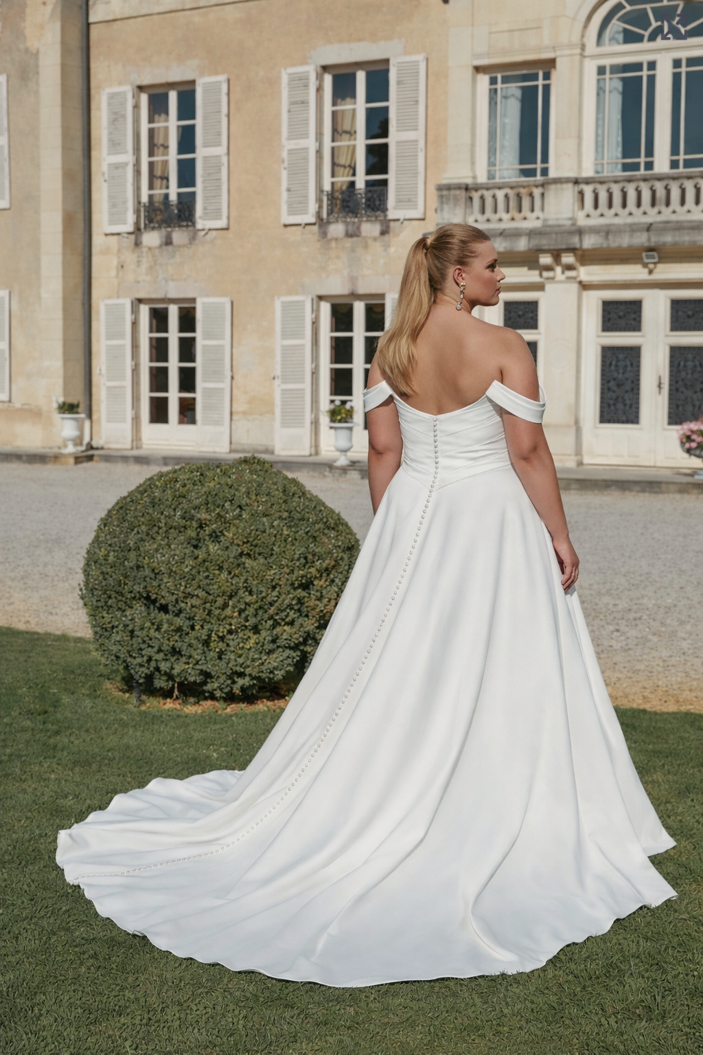 An elegant satin A-Line gown with pearls and tonal beading on the bodice. Lovely satin off the shoulder sleeves complete the bodice & pretty pearl buttons run down the entire back of the dress onto a chapel length train.